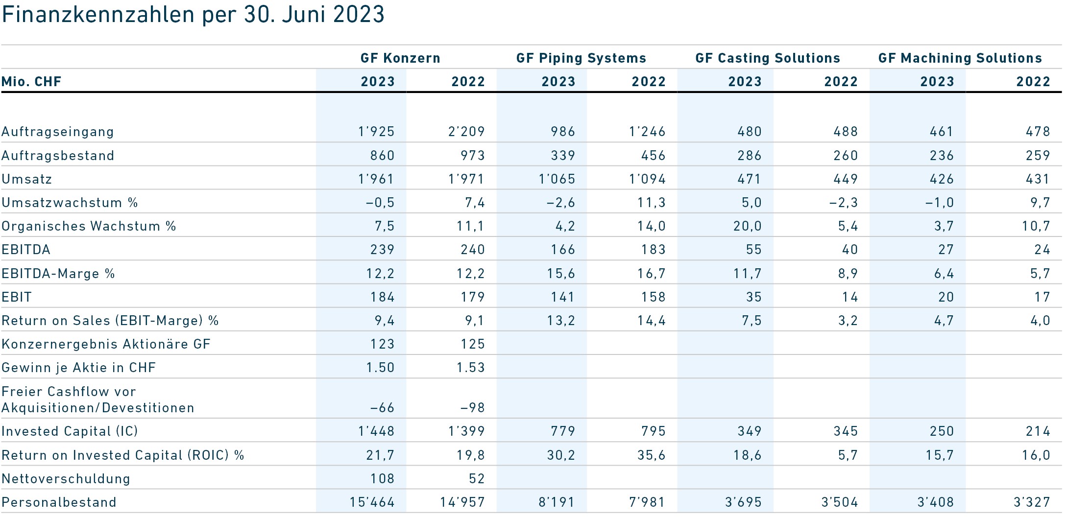 Im ersten Halbjahr 2023 entwickelte sich die Geschäftstätigkeit von GF trotz der erheblichen negativen Währungseffekte und anhaltenden geopolitischen Spannungen weiterhin positiv. Der Umsatz mit nachhaltigen Produkten und Lösungen, die durch langfristige Megatrends wie Urbanisierung, Energieeffizienz und eine hohe Nachfrage nach sauberem Trinkwasser gestützt werden, tragen auch weiterhin zur guten Entwicklung bei.