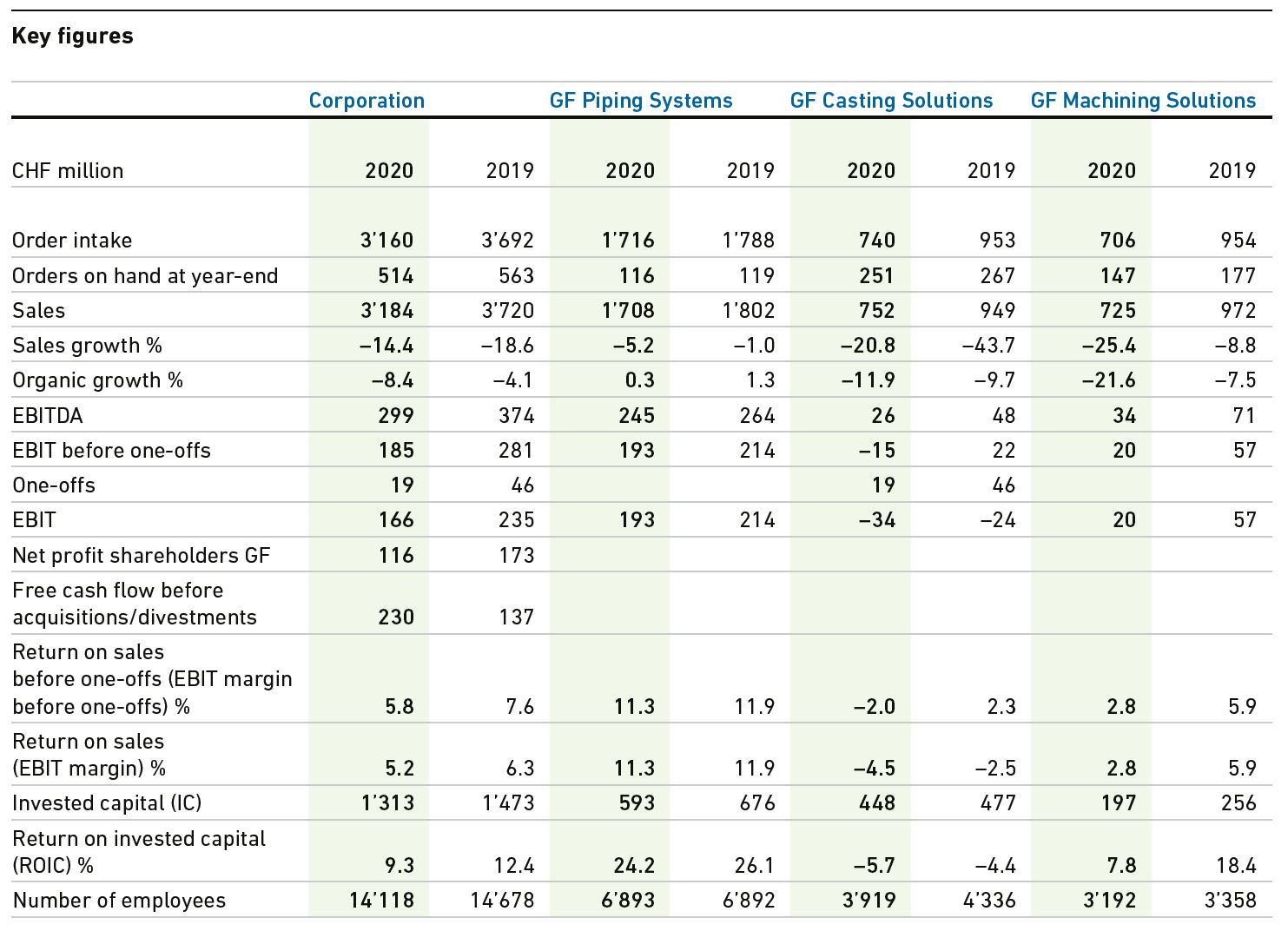 归属于股东的净利润达1.16亿瑞士法郎(2019年:1.73亿瑞士法郎)。收购前的自由现金流高达2.3亿瑞士法郎,比去年增加9300万。每股收益为28瑞士法郎(2019年:42瑞士法郎)。在即将举办的年度股东大会上,董事会将提议每股股息为15瑞士法郎(2019年:每股股息25瑞士法郎),这是鉴于强大的自由现金流和GF卓越的市场地位。